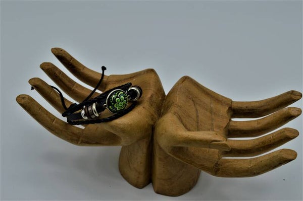 Bracelet with hand-painted cabochon. The bracelet is adjustable with a pull rope system. The cabochon is finished with two layers of acrylic lacquer for protection.