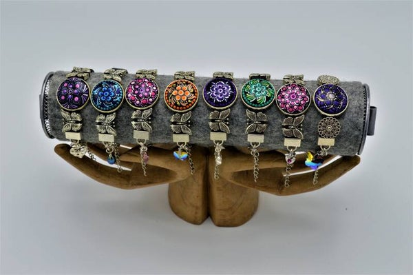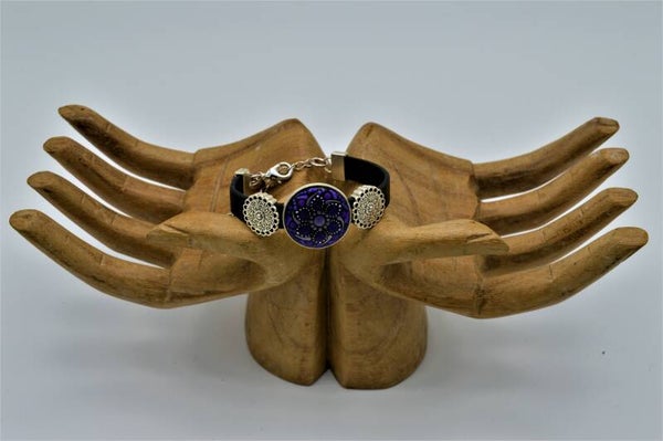 Armband met handbeschilderde cabochon. De armband is verstelbaar, heeft een charm hangertje bij de sluiting en een verlengketting. De cabochon is met twee lagen acryllak afgewerkt ter bescherming.