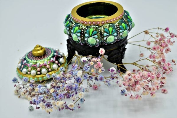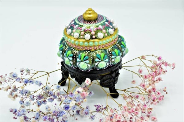 Hand-painted box, cast from high-quality porcelain plaster. . This box has a mandala pattern applied with different types of artist-quality acrylic paint. Furthermore, the box is sealed with 2 layers of lacquer.